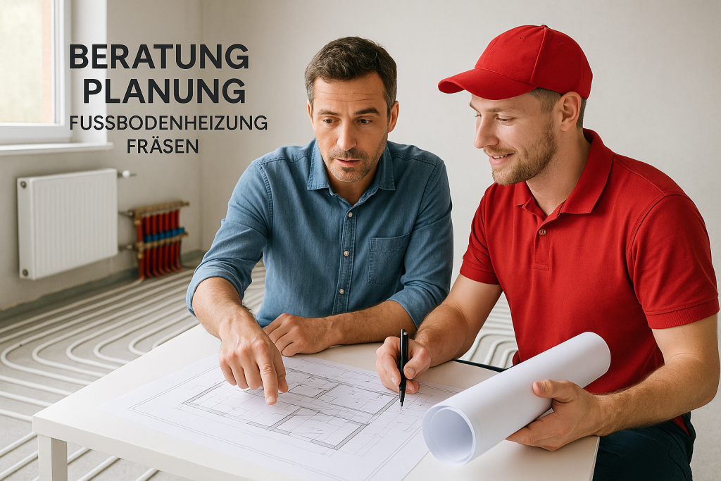 Ausarbeitung eines detaillierten Angebots inklusive Rohrnetzplan, Fräsbild, Materialliste (u. a. Aluverbundrohre 16×2 mm), benötigte Vorleistungen (Entkernung, Schleifen), Zeitplan und Kostentransparenz. Auf Wunsch alternative Varianten (z. B. Trockenestrich mit integrierter Fräsung) mit Vor- und Nachteilen.