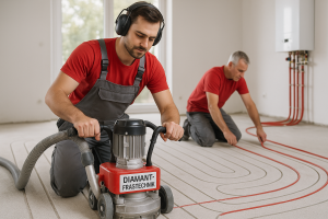 Zu Beginn analysieren wir den vorhandenen Estrichaufbau, identifizieren Leitungen und mögliche Hindernisse und erstellen ein individuelles Fräskonzept mit präzisen Verlegeabständen und Frästiefen. Die Auswahl des passenden Diamantwerkzeugs und die Festlegung von Frästiefe und -breite erfolgt auf Basis der Estrichart (Zement, Anhydrit, Beton) und der Rohrdimension.